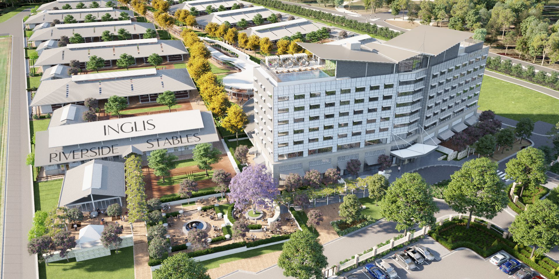 The above photo is show casing the, The William Inglis Hotel which is a 5 Star hotel operated by Accor Hotel Group and the Inglis’ Riverside Stables complex, a world-class horse auction facility and stables.